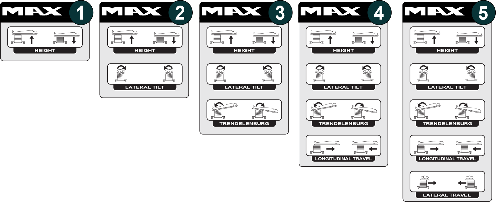 The Max table comes with standard 500 pound load rating, 2″ patient pad, 24″ wide top, locking swivel castors, narrow base for easy patient transfer, simultaneous motion movements and extremely low boarding height. Also with bellows, power input block & removeable power cord